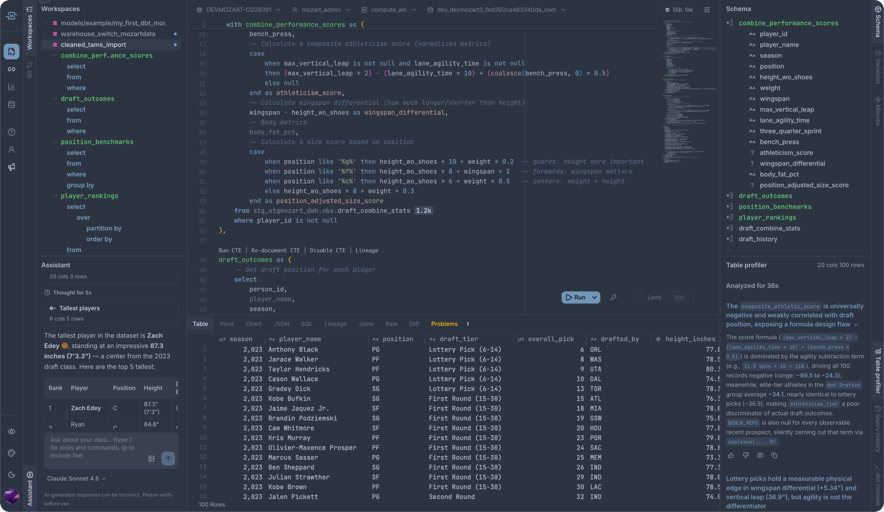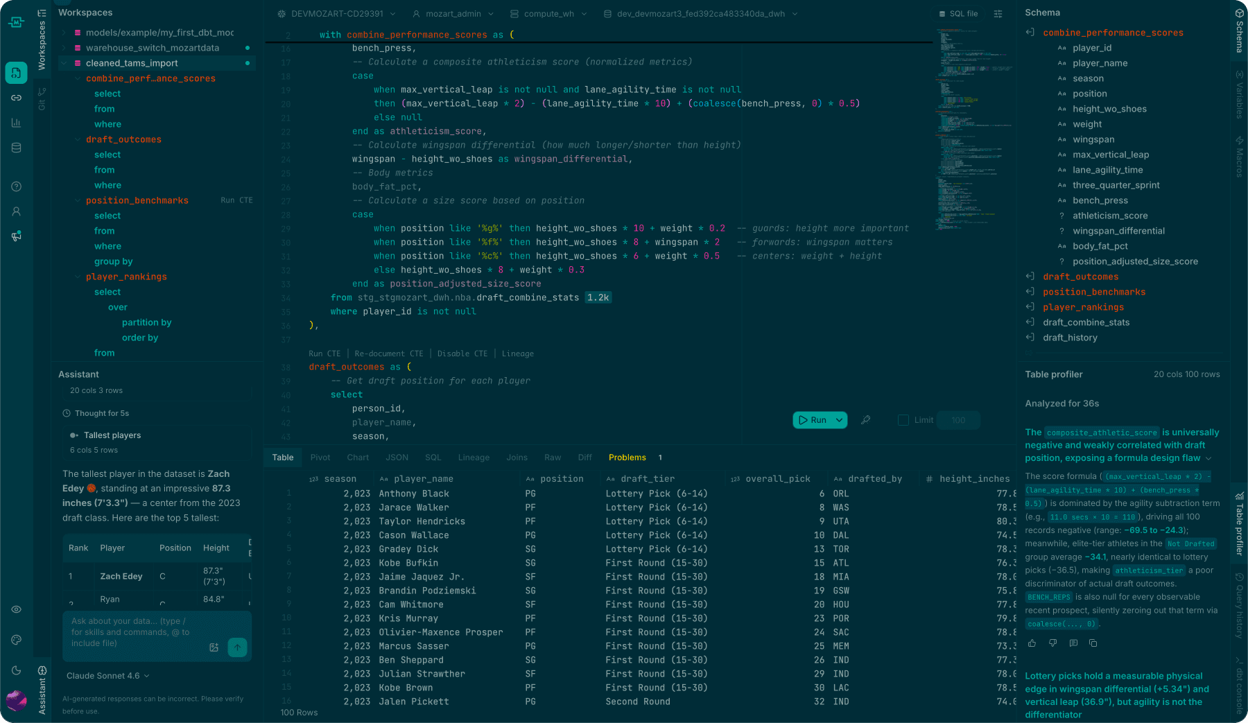 I built the Monaco theming system with 18 themes, semantic token mapping, and CSS variable integration, then went deep on dialect-aware intelligence. The editor supports Snowflake, BigQuery, Databricks, and Redshift with behavior that goes well beyond syntax highlighting.