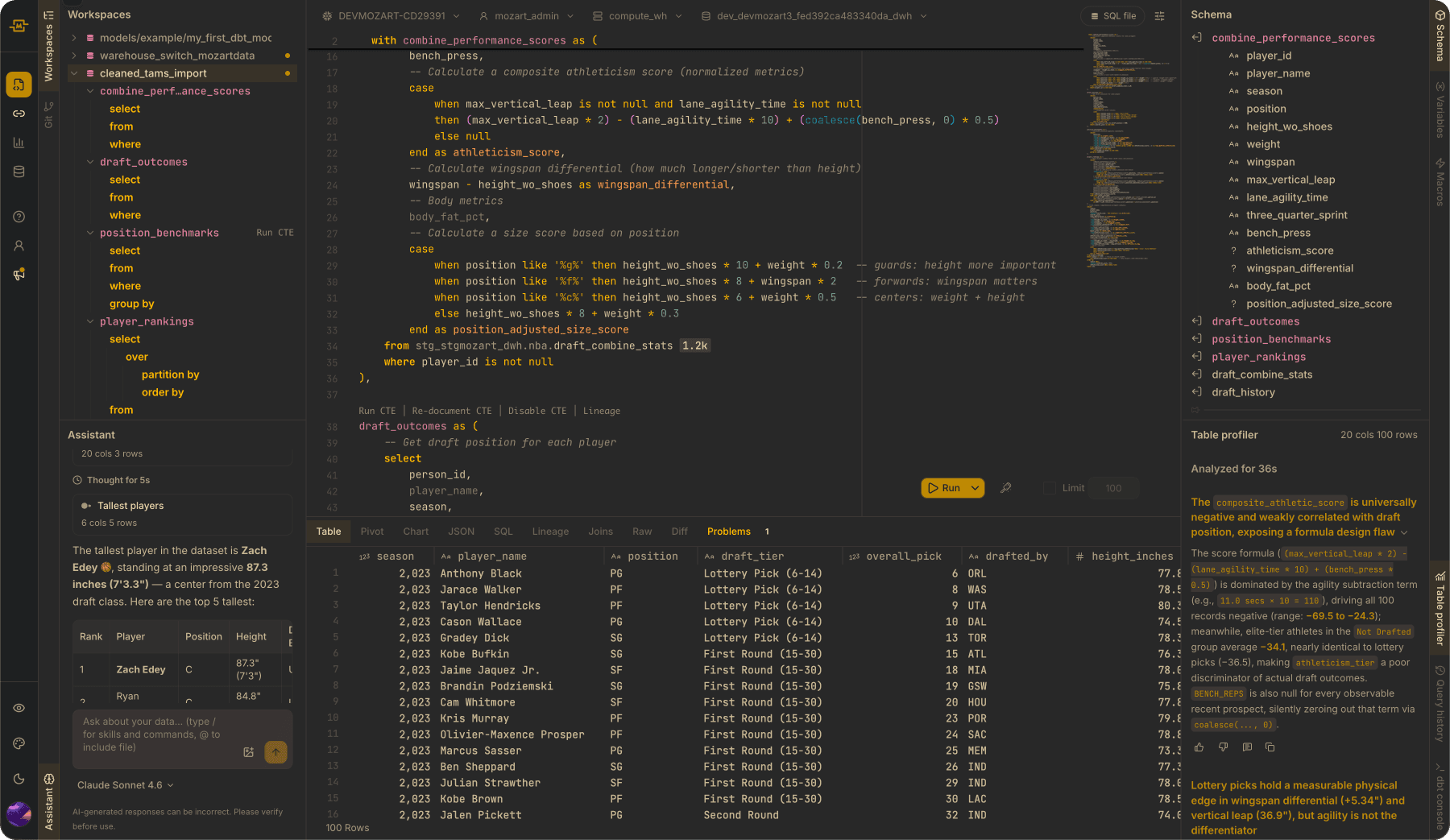 The design principle was that the AI should function like a crew rather than a single assistant. One agent writes SQL, another reviews it, a third pressure-tests the data. The AI doesn't replace the engineer's judgment. It gives them more surface area to apply that judgment.